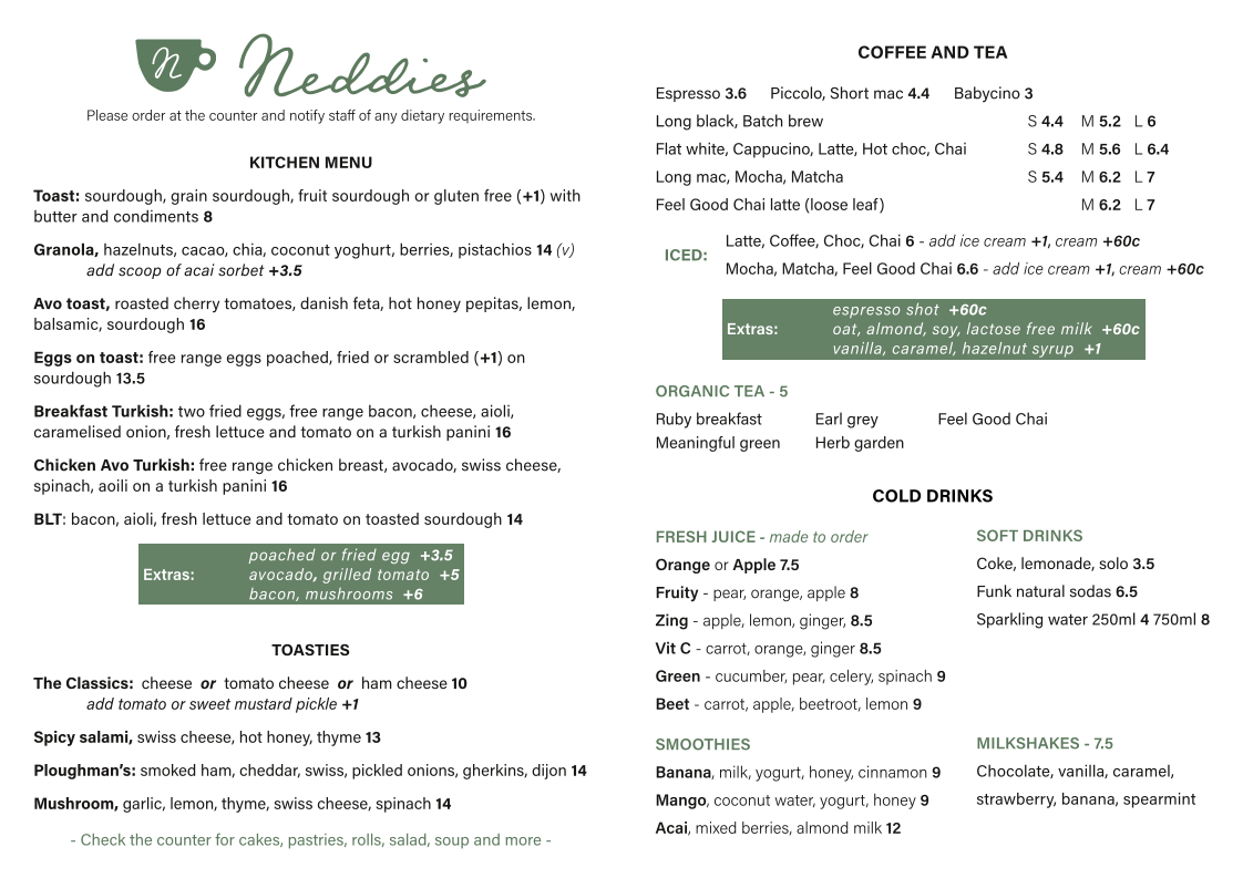 The menu at Neddies offers a variety of options suited for breakfast, coffee breaks, and light meals. It is organized into clear sections featuring toasties, coffee and tea, and soft drinks, allowing visitors to easily identify their choice of food or beverage.