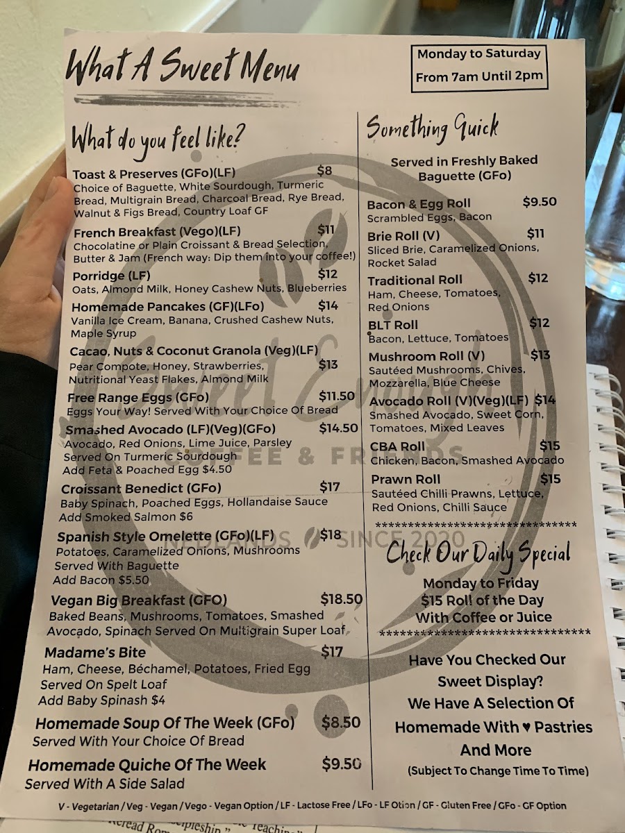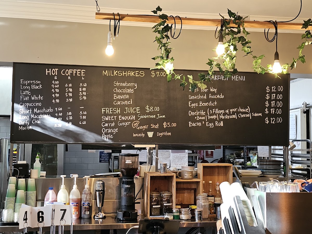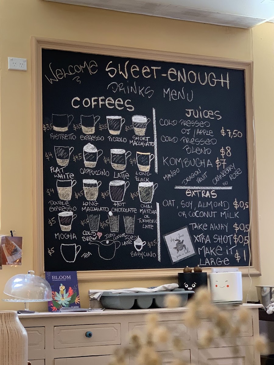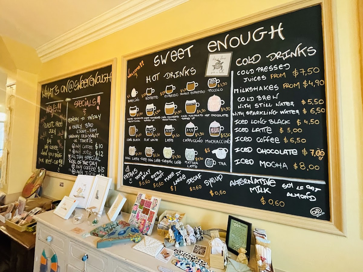 Coffee and Tea selections cover a broad spectrum of popular espresso-based drinks, including espresso, piccolo, flat white, cappuccino, latte, and mocha. The menu also features a variety of specialty drinks such as matcha, chai, and loose leaf chai latte, alongside hot chocolate and batch brew coffee. For younger visitors, a babycino is available.